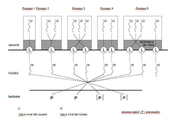 • El proceso 3 hace corresponder a múltiples HUs sobre un número menor o igual de LWPs. Esto permite que la aplicación especifique el grado de paralelismo que soportara a nivel de núcleo.