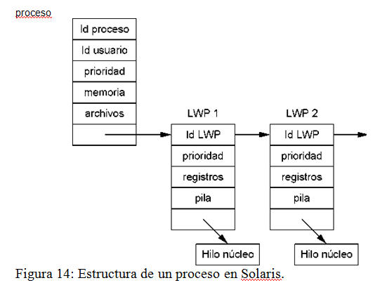 Cada proceso en Solaris tiene la información clásica del bloque de control del proceso, con un apuntador a los LWP asociados, según se puede observar en la Figura 14.