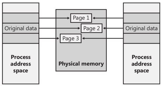 Al igual que en la mayoría de los sistemas operativos modernos, Windows provee un mecanismo para compartir memoria entre los procesos y el sistema operativo. La memoria compartida puede definirse como la memoria que es visible por más de un proceso, o que está presente en más de un espacio de direcciones virtuales de procesos. Por ejemplo, si dos procesos usan la misma DLL, tendría sentido cargar las páginas de código referenciadas de aquella DLL a la memoria física sólo una vez y compartir esas páginas entre los procesos que mapean la DLL, como lo muestra la siguiente figura.