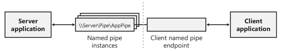 La comunicación por tuberías nombradas consiste en un servidor de tubería nombrada y un cliente de tubería nombrada. Un servidor de tubería nombrada es una aplicación que crea una tubería nombrada a la cual los clientes se pueden conectar. El nombre de una tubería nombrada tiene el formato “\\Server\Pipe\PipeName”. El componente ‘server’ del nombre especifica la computadora en la cual se está ejecutando la tubería nombrada (un servidor de tubería nombrada no puede crear una tubería nombrada en un sistema remoto). El nombre puede ser un nombre de DNS, un nombre de NetBIOS o una dirección IP. El componente ‘pipe’ del nombre debe ser el string “Pipe”, y ‘pipeName’ es el nombre único asignado a una tubería nombrada. Ésta es única porción del nombre de la tubería que puede incluir subdirectorios; un ejemplo de tal sería: