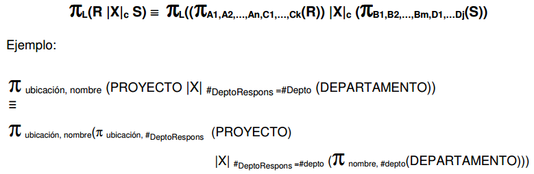 Nota: el orden en el que se conmutan las proyecciones y las selecciones dependerá de la naturaleza de los datos, ya que en el caso de tablas con muchos atributos, es aconsejable bajar las proyecciones mientras que en el caso de tablas con miles de tuplas insertadas es aconsejable bajar la selección, es decir hacerla lo antes posible.