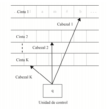 Las MT de este modelo tienen una cantidad finita K de cintas. La cinta de entrada es siempre la primera. Cuando es necesario se especifica también una cinta de salida. Por cada cinta existe un cabezal, y sigue habiendo una sola unidad de control (ver la figura