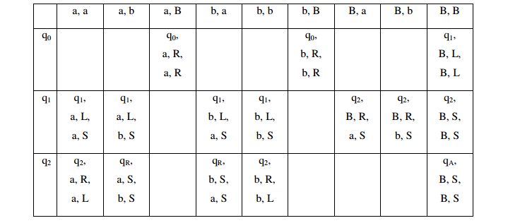 • Q = {q0, q1, q2}. El estado q0 es el estado de copia de la entrada desde la cinta 1 a la cinta 2. El estado q1 es el estado de posicionamiento de los cabezales 1 y 2 luego de la copia. Y el estado q2 es el estado de comparación de las cadenas de las cintas 1 y 2.