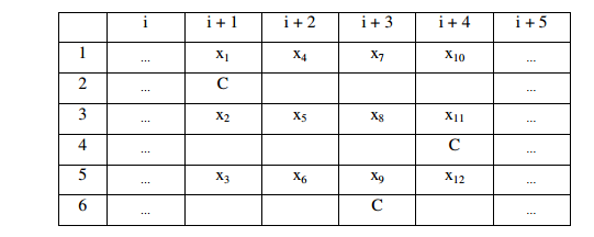 La cinta de M2 tiene 2K tracks. Los primeros dos tracks representan la cinta 1 de M1, los siguientes dos tracks representan la cinta 2, y así sucesivamente. Dado un par de tracks que representan una cinta de M1, el primer track almacena en sus distintas subceldas el contenido de las celdas correspondientes de M1, mientras que en el segundo track hay blancos en todas las sub-celdas salvo en una que lleva la marca C, para indicar que la celda representada está apuntada por un cabezal. La tabla siguiente ejemplifica la representación descripta, para el caso de 3 cintas y por lo tanto 6 tracks: