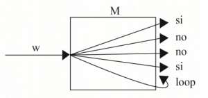 En la figura, los términos sí, no y loop, indican que la computación correspondiente se detiene en qA, se detiene en qR, o no se detiene, respectivamente. En este caso la MTN acepta la entrada w porque al menos una de sus computaciones la acepta.