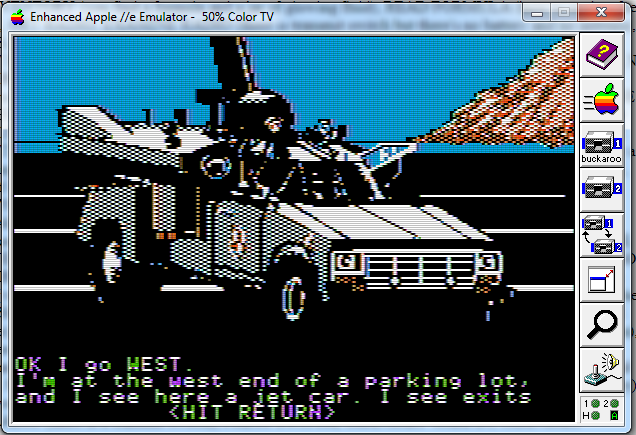 –¡Ya está!– me dije. Pero no pude dejarlo de lado, hasta que lo encontré para Apple II, por lo que necesitaba un emulador de Apple II para poder correrlo. Un poco de búsqueda, un load de la imagen del diskette, un load de la segunda imagen del diskette, y… comenzamos el juego.