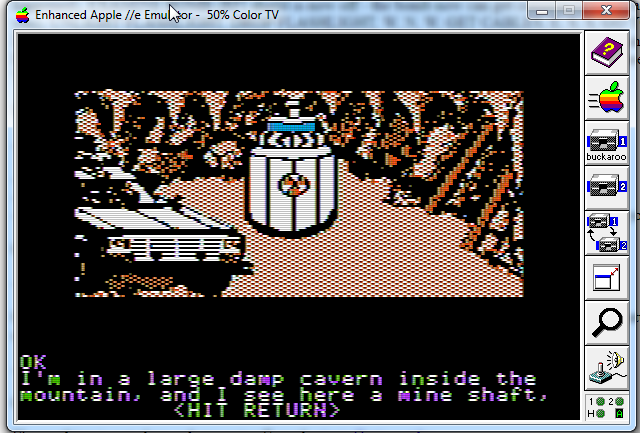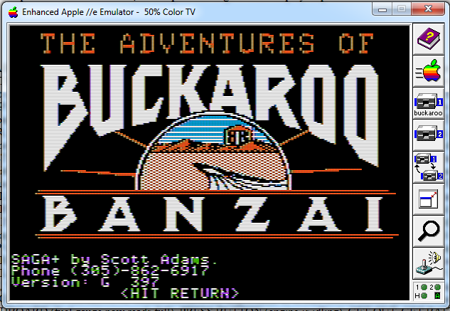 Es muy disfrutable, para pasar un buen rato. Les dejo ambos archivos, el emulador de Apple II y el juego (click en cada imagen para descargar y descomprimir todo en la misma carpeta). Además les dejo un archivo con un ejecutable con varias aventuras de texto de Scott Adam.