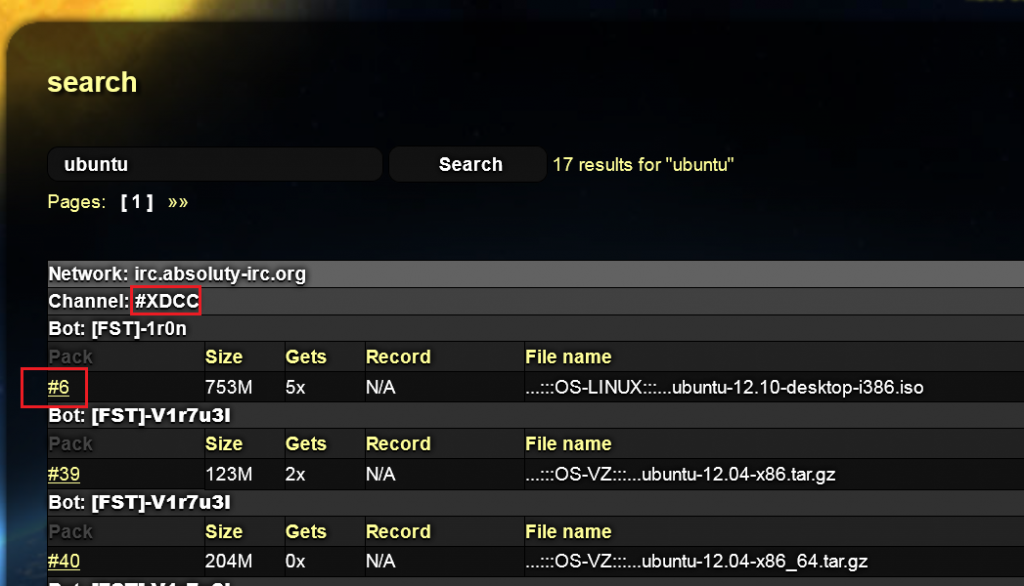 Veamos la estructura de este comando: “/ Msg” es enviar un mensaje privado a otro usuario en IRC, “[FST] -1r0n” es el nombre de usuario del bot, “xdcc” es el nombre del protocolo de transferencia de datos, y “# 6” es el número de paquete. Podemos ingresar estos comandos de forma manual, pero la mayoría de los motores de búsqueda lo hacen por nosotros, de modo que solo necesitamos copiar y pegar.