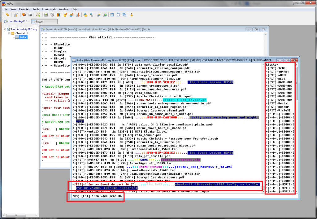 Me acuerdo de verlo a un antiguo compañero de vivienda y amigo pasarse horas en las salas del mIRC para descargar las últimas series de anime. Se abarrotaba toda la banda ancha, jajaja. Recapitulando, instalamos mIRC, habilitamos XDCC, y ahora, descarguemos:
