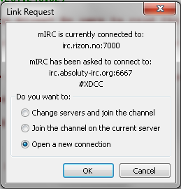 … hagamos clic en el nombre del canal y ¡dejemos que mIRC haga el resto! Alternativamente, podemos agregar manualmente el servidor y usar un comando para ingresar a la sala de chat correcta, que se explicará más adelante. Este mensaje aparecerá y le sugerimos que seleccione “Abrir una nueva conexión“, ya que permitirá descargar varios archivos a la vez de diferentes servidores y canales.