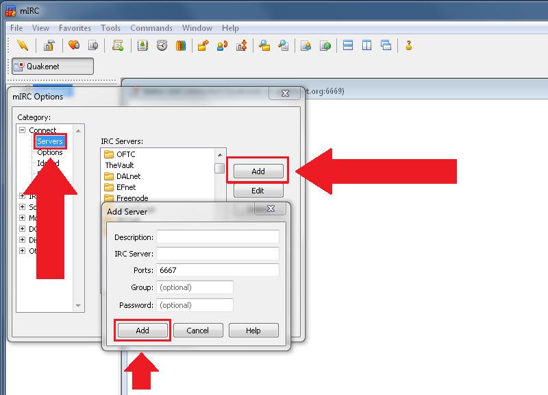 Por alguna razón, es posible que deseemos pasar esto a mano en lugar de utilizar un enlace IRC (a todos nos gustan las cosas difíciles). Para agregar un servidor a la lista que tenemos en mIRC, vayamos a configuración y a “Conectar – Servidores“. Hagamos clic en el botón “Agregar” e ingresemos la dirección del servidor en el campo “Servidor IRC“, no olvidemos ingresar una descripción en “Descripción“. También podría ser útil agregar un grupo, por ejemplo “XDCC“, para encontrar fácilmente la entrada en la lista de servidores grandes; podrías llamarlo “XDCC” o algo así. El “puerto” se puede dejar intacto.