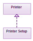 Denota la implementación de la funcionalidad definida en una clase por otra clase. Para mostrar la relación en UML, se dibuja una línea discontinua con una punta de flecha sólida sin rellenar de la clase que define la funcionalidad de la clase que implementa la función. En el ejemplo, la impresora está implementando las preferencias de impresión establecidas mediante la interfaz de configuración de la impresora.