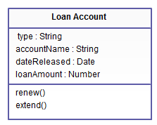 En el ejemplo, se representa una clase llamada “Loan Account” (un préstamo, por lo general los ejercicios y las implementaciones más grandes tienen que ver con el mundo de las finanzas). Las clases en diagramas de clase están representadas por cuadros que están divididos en tres: