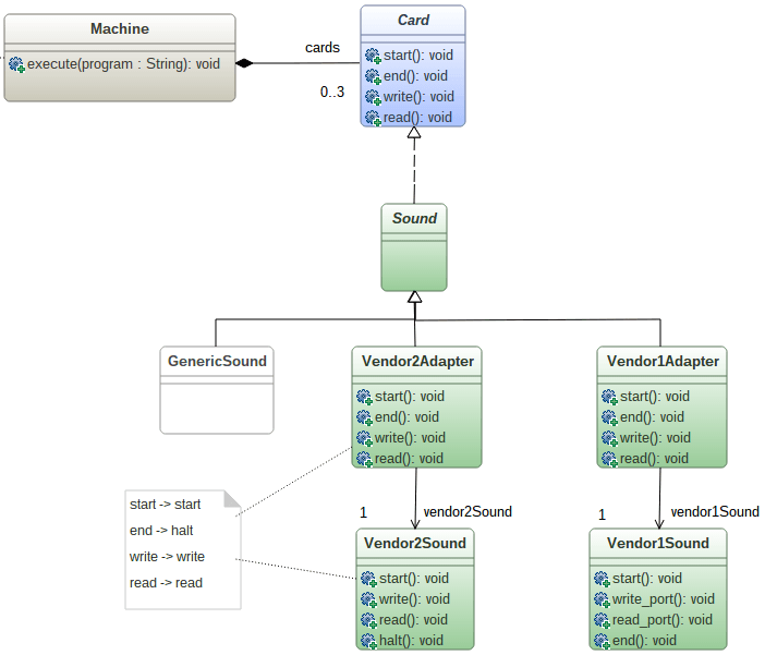Tener múltiples elecciones sobre nuestra SoundCard es agradable. Sin embargo, incluso si están en la misma página sobre la forma en que debería funcionar la tarjeta, no usan una interfaz común y proporcionan diferentes operaciones que tienen casi la misma semántica. En este contexto, los adaptadores son un tipo de convertidores de socket que envolverán al proveedor de tarjetas de sonido e implementarán la interfaz común al delegar el comportamiento a la tarjeta envuelta. Por ejemplo, Vendor2Adapter implementa el método end () delegando su ejecución al método halt () del elemento Vendor2Sound.