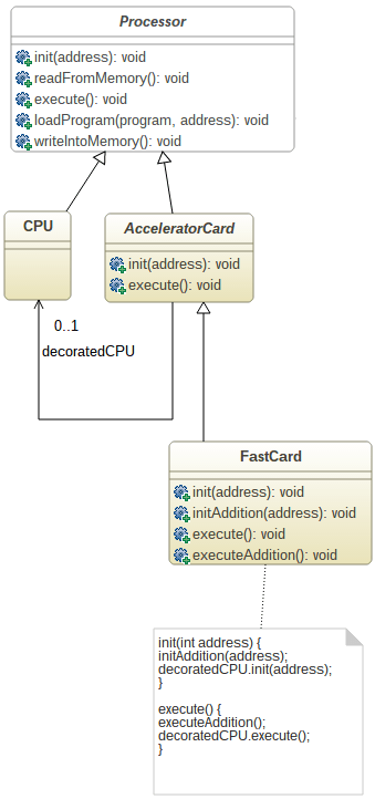 Nuestro procesador siempre debe tener el mismo comportamiento. Pero nos gustaría agregarle un nuevo comportamiento sin perturbar su proceso original. El patrón decorator es, por lo tanto, un gran candidato. Agrega un comportamiento adicional para la fase de inicialización y la fase de ejecución. La implementación o la FastCard muestra que cuando se llama al método init (), la tarjeta llama primero al método adicionalInit (), luego llama al método init () de la CPU que decora (bueno, en este caso, la diferencia entre el el patrón proxy y el patrón decorator es la delgadación, por cierto, algunas personas lo llaman ‘proxy inteligente’). Lo mismo se realiza para el método execute ().