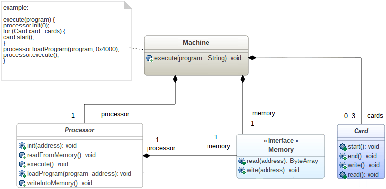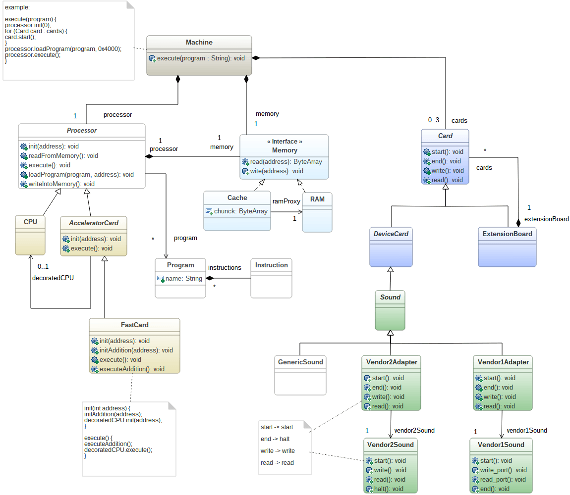 El objetivo principal del patrón facade es ocultar la complejidad de un sistema al proporcionar métodos fáciles y comprensibles. En nuestro caso, el método execute () de Machine Element nos permite ejecutar un programa dedicado. La forma en que se ejecuta la ejecución del programa es bastante compleja. El procesador debe iniciarse así como las tarjetas adicionales. Luego, el programa que debe ejecutarse debe cargarse y ubicarse en la memoria en una dirección específica. El método execute () oculta toda esta complejidad al organizar todas las inicializaciones / inicializaciones de objetos y al agregar todos los valores mágicos requeridos. Este patrón se usa casi todo el tiempo cuando los sistemas complejos necesitan ser manejados simplemente.